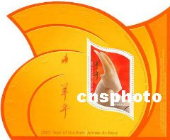 由溫哥華華裔美術(shù)家設(shè)計的這枚郵票,票面是鮮紅背景下襯托的一只金色公羊頭像,造型壓紋,質(zhì)地如絲,充滿中國傳統(tǒng)新年的喜慶色彩。郵票左下方寫有中文草書“羊年”,旁邊還有“羊年”的英法兩種文字。