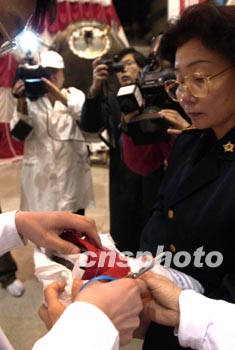 一月八日上午,“神舟”四號飛船返回艙開艙儀式在中國空間技術研究院舉行,北京公證處的公證員對剛剛?cè)〕龅娘w船搭載物進行公證。作者:張煒