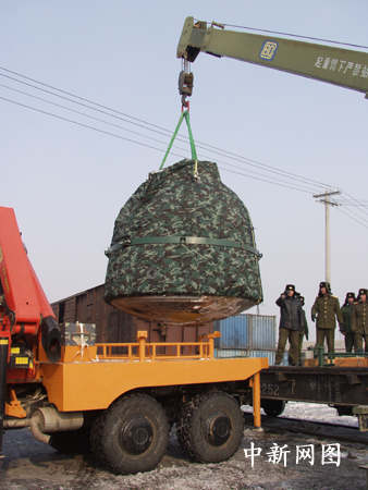 返回艙吊裝上專用列車,沿鐵路駛往北京。孫陽(yáng) 攝