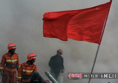 20日各地救援隊(duì)在結(jié)古鎮(zhèn)災(zāi)區(qū)煙塵中堅(jiān)持抗震救災(zāi)