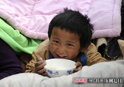 青海玉樹體育場地震民眾安置點(diǎn)一個(gè)孩子露出笑容