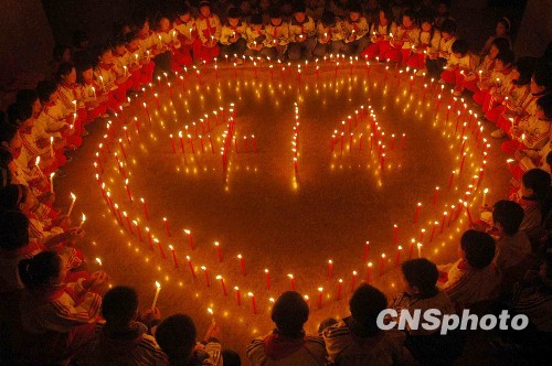 圖:小學(xué)生為玉樹災(zāi)區(qū)點(diǎn)燭祈福