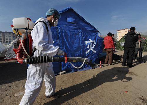 圖:玉樹地震廢墟消毒防疫工作展開