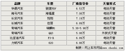 通過上面的表格我們可以看出,8款車型大部分配備了電動(dòng)車窗,而價(jià)格也都在7萬元左右。除了價(jià)格最便宜的QQ僅配備了手動(dòng)外掀式天窗外,其他車型都配備了電動(dòng)車窗。對(duì)于7萬元左右這個(gè)價(jià)位,能夠擁有天窗,天氣晴朗的時(shí)候與大自然來個(gè)親密接觸,絕對(duì)是一種放松心情的不錯(cuò)選擇。