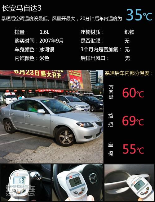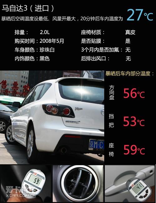 進口馬自達3在暴曬時路人的回頭率很高,也許是官方進口時沒有這個配色,所以珍珠白自噴漆的它在路上十分惹眼。捏住出風口大大的葉片就能控制出風方向,用起來十分方便?照{(diào)賣力工作20分鐘后,最終車內(nèi)溫度下降到了27度。