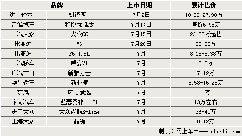7月份上市的新車型中聚集了眾多知名大品牌。譬如一汽大眾、進(jìn)口大眾、廣汽豐田等。而按照車型細(xì)分,其中涵蓋小型車、緊湊級(jí)車、以及中級(jí)車備受關(guān)注的SUV車型等,其中自足品牌占據(jù)了一半,達(dá)到了6款車型,分別是江淮和悅優(yōu)雅版比亞迪M6和F6 1.8;威姿V1;新駿捷;風(fēng)行景逸,合資車型一汽大眾CC;新雅力士;三菱翼神;晶銳,進(jìn)口車型鈴木凱澤西;尚酷R-line,共計(jì)12款車型。