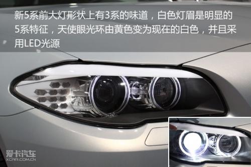 前大燈從外形上看有點類似于現(xiàn)款3系的設計,但很明顯的5系風格是擁有白色的燈眉設計,據(jù)寶馬官方介紹,這樣的設計將使得前大燈給人一種注視前方的感覺,更加有神。而與上代5系相比非常明顯的變化是天使眼大燈由此前的黃色變?yōu)榘咨,更加時尚和富有科技感,并且天使眼的發(fā)光源采用了LED燈組設計。