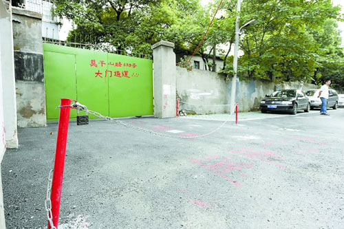 綠色的鐵門上,用紅色油漆赫然寫著“莫干山路633號(hào)大門通道”,被圈的地面上寫著“大門通道”幾個(gè)大字。