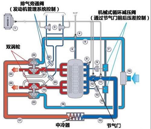 低轉(zhuǎn)速或者怠速的時(shí)候,排氣旁通閥完全關(guān)閉,所有的廢氣通過兩個輕質(zhì)小渦輪,獲得最大的增壓效果,提高低轉(zhuǎn)速下油門響應(yīng)性以及動力輸出;在發(fā)動機(jī)滿負(fù)荷的情況下,通過部分打開排氣旁通閥以獲得一個比較恒定的增壓壓力,不增加耗油量。