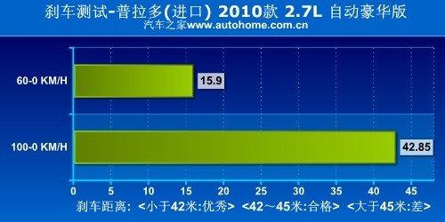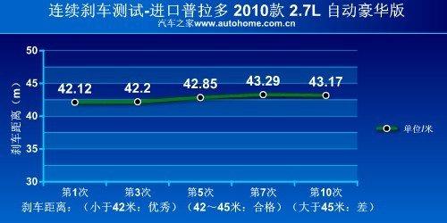 加速偏弱或許對一些人來說不是問題,而剎車無論如何都不能含糊。這一點(diǎn)上普拉多的表現(xiàn)得很稱職。盡管由于車身較高,剎車姿態(tài)看起來有些令人不安,但從100公里/小時剎車到靜止只需要42.85米,而且剎車一直穩(wěn)定在43米左右,已經(jīng)算是非常不錯的成績。