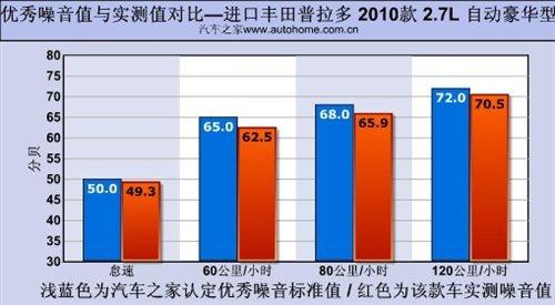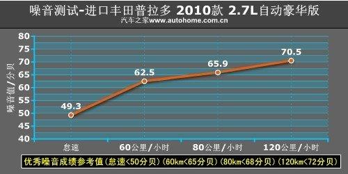 舒適性是普拉多的強(qiáng)項,日常行駛時的噪音能夠明顯感覺到是非常低的,這一點(diǎn)在之后的測試中得到了驗證。我們在一條平直無車的高速公路上測得普拉多的噪音值為:怠速49.3分貝;60公里/小時62.5分貝;80公里/小時65.9分貝;120公里/小時70.5分貝。