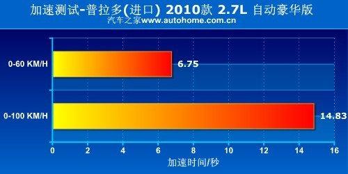 在加速測試中,2.7L發(fā)動機(jī)動力較弱的特點(diǎn)暴露無遺。起步時車輛出奇的安分,發(fā)動機(jī)被無情的壓制在低轉(zhuǎn)速區(qū)間,而攀升的過程又顯得特別漫長。另一方面,齒比稀疏的四擋變速箱對于這種動力偏弱的車型來說是不太利于加速的。因此,普拉多0-100公里/小時跑出14.83秒的加速成績也就不足為奇了。