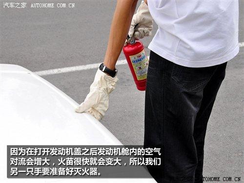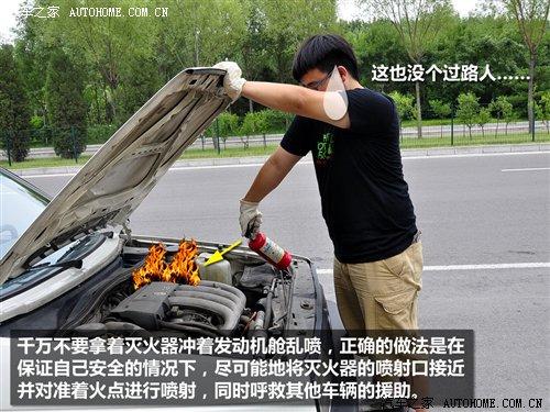步驟三:發(fā)動機(jī)蓋打開后由于空氣對流增強(qiáng),火苗會迅速變大,這時我們不能驚慌,拿著滅火器沖著發(fā)動機(jī)艙亂噴,在保證自己安全的情況下,盡可能地將滅火器的噴射口接近并對準(zhǔn)著火點(diǎn)進(jìn)行噴射,同時呼救其他車型的援助(因?yàn)檐囉玫哪欠N小罐滅火器的容量有限)。