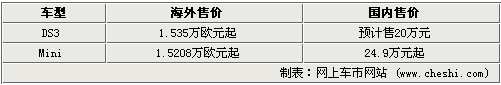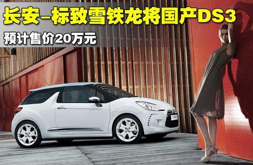 而在目前雪鐵龍DS系列車(chē)型僅有DS3一款,不出意外的話(huà)它將是長(zhǎng)安-標(biāo)致雪鐵龍推出的首款車(chē)型,預(yù)計(jì)將在2012年投產(chǎn)。DS3是一款雙門(mén)運(yùn)動(dòng)型小車(chē),競(jìng)爭(zhēng)對(duì)手則是Mini,在歐洲地區(qū)的售價(jià)1.5萬(wàn)歐元起。Mini在國(guó)內(nèi)的售價(jià)為24.9萬(wàn)元起(海外售價(jià)同樣是1.5萬(wàn)歐元起),考慮到DS3國(guó)產(chǎn)的原因,它的售價(jià)很可能會(huì)在20萬(wàn)元左右,比Mini要便宜一些。而在國(guó)產(chǎn)前,這款車(chē)也在4月的北京車(chē)展上亮相過(guò),看來(lái)是早有國(guó)產(chǎn)準(zhǔn)備。
