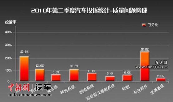 報(bào)告顯示,投訴統(tǒng)計(jì)的具體比例為:發(fā)動(dòng)機(jī)占22.8%;變速器占12.0%;離合器占6.6%;轉(zhuǎn)向系統(tǒng)占10.8%;制動(dòng)系統(tǒng)占8.1%;前后橋及懸架系統(tǒng)占5.4%;輪胎6.0%;車(chē)身附件及電氣占25.5%;空調(diào)系統(tǒng)2.8%。