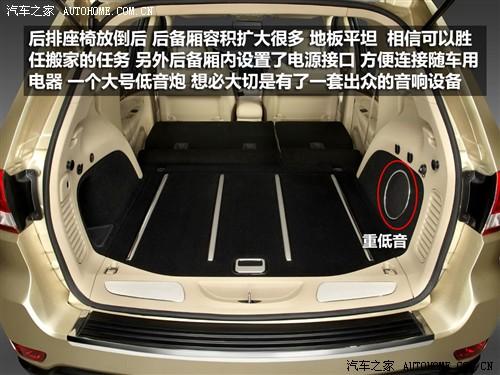 座椅放倒后空間后備廂空間得到很大擴大,放倒后地板平整,我想可以勝任搬家的任務,如果用作旅行,后備廂容積足以放下你所需的物品,不是還有車頂行李架呢嘛?后備廂還這是了一個電源接口,方便隨車用電器連接使用。另外在后備廂內(nèi)發(fā)現(xiàn)了一個尺寸不小的低音炮,相信新款大切可以給我們帶來不錯的視聽感受。