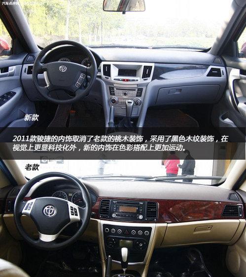 2011款駿捷的內(nèi)飾取消了老款的桃木裝飾,采用了黑色木紋裝飾,在視覺上更顯科技化外,新的內(nèi)飾在色彩搭配上更加運動。中控臺和老款車型差異很大,采用了大量的按鍵設(shè)計,中控鎖、后備箱開關(guān)、油箱開關(guān)集成在最上面。新款駿捷的三幅方向盤改成了四幅式設(shè)計,感覺更加穩(wěn)重。