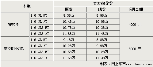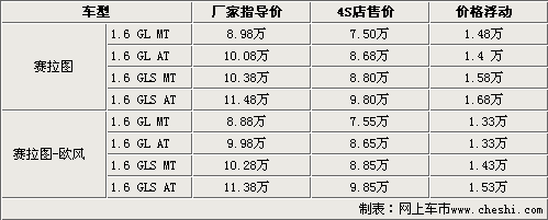在調(diào)整完售價后,賽拉圖及賽拉圖歐風(fēng)GL低配車型的售價均降到了9萬元以下,完全進(jìn)入了自主車型的售價區(qū)間。同時頂配車型的售價最高也不過11.5萬。與此同時更具網(wǎng)上車市價格監(jiān)測系統(tǒng)顯示,在廠家下調(diào)完售價后,賽拉圖及賽拉圖歐風(fēng)仍有很大的價格浮動,最高優(yōu)惠金額高達(dá)1.68萬。具體車型售價見下表: