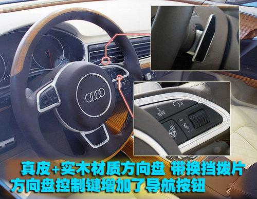 方向盤部分能夠看到奧迪專為跑車化而設(shè)計(jì)的三幅運(yùn)動(dòng)型方向盤,通常A8的方向盤是更加舒適化的4幅方向盤。真皮縫制與實(shí)木材料的應(yīng)用是奧迪為豪華車市場(chǎng)專門打造的。在這里我們發(fā)現(xiàn)了以前奧迪并未在方向盤上安裝的“Nav”即導(dǎo)航按鈕。