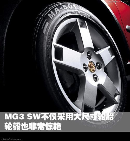 第一眼看到MG3sw,我們就會被純正的英式風(fēng)格所震撼。在MG3sw的車頭部分,我們可以看到很多分體設(shè)計(jì)的元素,前大燈、霧燈、中網(wǎng)都采用了對稱的排列方式,在蘊(yùn)含動感的同時(shí)也有一絲紳士風(fēng)范。車頭和車尾低平而飽滿,引擎蓋上3道線條均勻地勾勒出一種力量感。最小離地間隙大于160mm的高通過性底盤,與車身顏色不同的全身大包圍,都表現(xiàn)出了MG3sw所具有的通過能力。