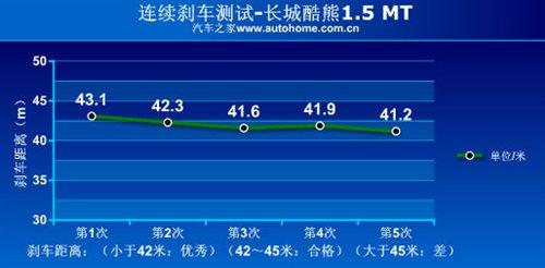 除了出色的乘坐和儲物空間,酷熊的動力和經(jīng)濟性也有不錯的表現(xiàn),從其連續(xù)制動的工況圖中可以看出,酷熊的平均制動距離在42米左右,且剎車系統(tǒng)的穩(wěn)定性也比較強。而在油耗測試中,6.7L/百公里的成績也低于我們的預(yù)期。