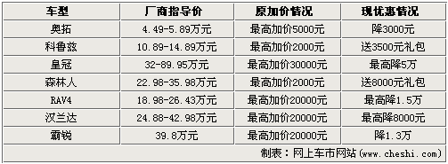 從上面統(tǒng)計的7款車型來看,其中皇冠創(chuàng)出最大差價,上市之后曾最高加價3萬元,而目前最高降幅已達(dá)5萬元。而SUV車型也是市場加價的主力,森林人、RAV4、漢蘭達(dá)、霸銳等都在上市后出現(xiàn)加價情況,除森林人只有2000元之外,其他都普遍加價2萬元,不過隨著市場競爭的激烈,最高降幅已達(dá)1.5萬元。