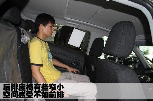 三菱ASX勁炫后排座椅靠背與坐墊的角度適中,不同身材體型的乘員在乘坐時能夠找到舒適的姿勢。但這款車的后排稍顯緊湊,頭部空間和腿部空間相對比較狹小。圖中的模特身高180厘米左右,頭部幾乎已經(jīng)要頂?shù)杰図敗?/p>