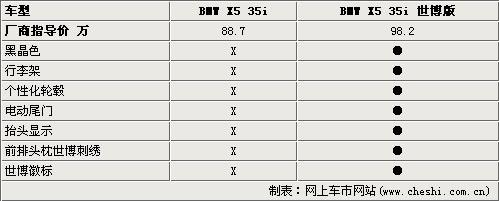 新X5 35i世博版以普通版35i為基礎(chǔ),在88.7萬元的基礎(chǔ)上增加了7項配置價格也相應(yīng)的提升了9.5萬元。不過雖然價位提升了9.5萬元,但是它的世博限量版概念以及增加的個性化配置倒也算得上比較劃算。