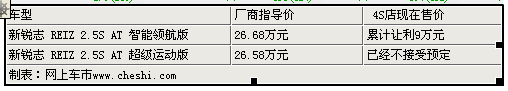 | 新銳志 REIZ 2.5S AT/MT特別導(dǎo)航版 | 24.58萬(wàn) | 21.08萬(wàn) | 3.5萬(wàn) | 有現(xiàn)車(chē)5種顏色全 |