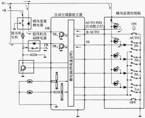 。1)鼓風機轉(zhuǎn)速控制?照{(diào)系統(tǒng)ECU根據(jù)設定的溫度、車內(nèi)現(xiàn)有溫度、車外溫度、陽光強度、蒸發(fā)器皿溫度等信號,發(fā)送不同的指令給鼓風機電機,并使之搭鐵,從而控制不同的鼓風機轉(zhuǎn)速。對于一些恒溫空調(diào)系統(tǒng),當發(fā)動機啟動時或冷卻液溫度低于預定值,空調(diào)系統(tǒng)ECU使鼓風機不起作用。