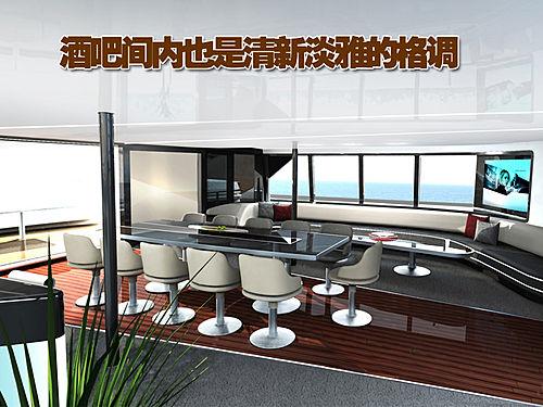 雙體船內(nèi)部的的酒吧間的中間放置的為一個(gè)較大的長方形桌子,兩面相向各放置了5個(gè)吧臺椅,而較窄的一端則放置了一個(gè)吧臺椅。在這一設(shè)置的-側(cè)放置的則是舒適的長沙發(fā),背后為明亮的窗戶,此外還配置了寬大的液晶顯示屏,另一側(cè)則是高高的吧臺設(shè)計(jì)。