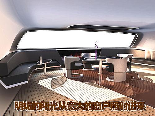 除了酒吧間外,其盥洗室也是同樣典雅的風(fēng)格。優(yōu)質(zhì)的鋁金屬裝潢增添了貴族的氣息,環(huán)形的設(shè)計(jì)營造了溫馨的氛圍。輪船的尾端則是一個(gè)愜意的小型休閑空間,原型的小桌前放置這四個(gè)小巧舒適的沙發(fā),在其后面則是兩個(gè)深色的沙發(fā),從寬大的一體式窗戶投進(jìn)了明媚燦爛的陽光。