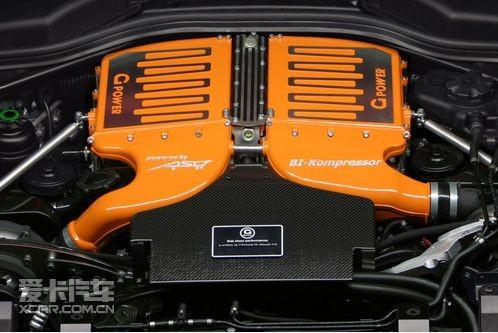 G-POWER將E60系列M5的V10發(fā)動機植入了造型優(yōu)雅的X6M上,同時,強化了活塞及連桿,并將排氣量由5.0升擴充到5.5升,還增加了2個ASA T1-316機械增壓器,使該車在6800轉(zhuǎn)/分時,能夠爆發(fā)出900馬力,8000轉(zhuǎn)/分時,能夠達(dá)到870N.m的最大扭矩。但為了保證此車的動力輸出,G-POWER不得不將寶馬的6速自動變速器更換為6速手動變速器,而X-DRIVE四驅(qū)系統(tǒng)也不得不變?yōu)楹筝嗱?qū)動。