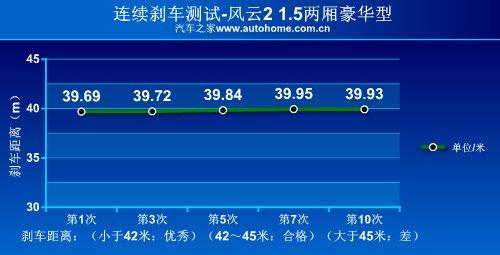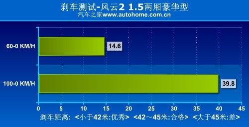我們對(duì)風(fēng)云21.5L兩廂豪華型進(jìn)行的性能測(cè)試中顯示,從100KM/h全力制動(dòng)到車輛靜止,剎車距離為39.8米,成績(jī)非常出色;剎車踏板回饋力較大,所以在剎車時(shí)需要使用更大力氣,在日常駕駛中踏板的余量偏大,不過一旦深踩,制動(dòng)效果明顯。