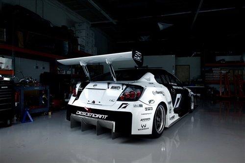 這輛賽車是在舊款Scion tC基礎(chǔ)上改裝而成的,是一款專為美國各類直線加速賽事而設(shè)計的賽車。它的發(fā)動機功率高達1100馬力,采用四輪驅(qū)動模式。為了確保它在賽道上的穩(wěn)定性,該車前后都安裝了大面積的定風(fēng)翼,以獲得巨大的下壓力。