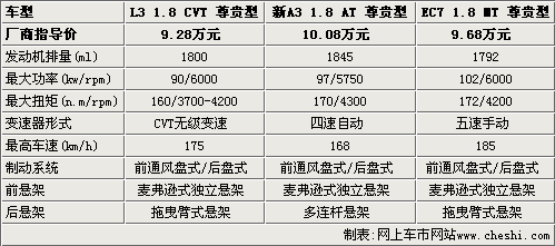 帝豪EC7的最大功率高于其他兩款車型,并且配備了五速手動變速箱,能擁有185km/h的最高車速是比較正常的。相對而言,奇瑞A3的動力優(yōu)勢并不明顯,再配備四速自動變速箱,動力和經(jīng)濟性也明顯不如其他兩款車型。比亞迪L3的發(fā)動機雖然功率比較小,但CVT無級變速箱給這款車加分不少,而且通風(fēng)盤式制動也不遜于其他產(chǎn)品。