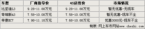 比亞迪L3、奇瑞新A3、帝豪EC7市場行情