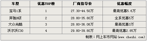 看完排行榜匯總表后不難發(fā)現(xiàn),定位于30萬上下的進口緊湊級別車型日子似乎都不太好過,全部都有2萬以上的優(yōu)惠幅度。其中優(yōu)惠幅度最高的車型是寶馬1系,最高優(yōu)惠5.6萬,全新上市的運動限量版也有1.9萬元優(yōu)惠,該款車型全國限量480臺,性價比表現(xiàn)不錯。優(yōu)惠最少的是沃爾沃C30,一款個性突出的兩門緊湊車型,最高優(yōu)惠2.85萬元。