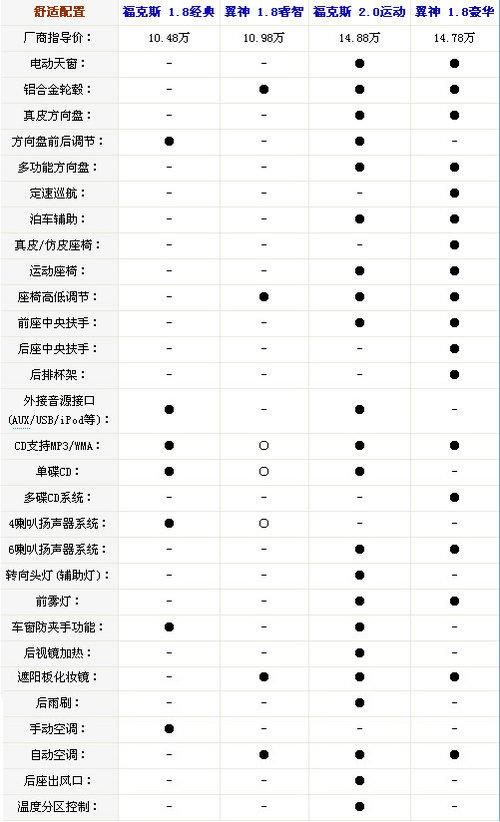 從兩車的價(jià)格來看,福克斯的價(jià)格區(qū)間更靠下一些,基本保持在15萬(wàn)以內(nèi),而翼神則有部分車型售價(jià)要高于這個(gè)區(qū)間。所以我們接下來的配置比較主要針對(duì)它們價(jià)格比較接近但又相對(duì)熱銷的車型,畢竟拿兩款并不是銷售主力的頂配車型對(duì)比的意義也不大。