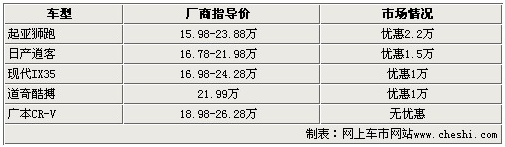 東風(fēng)日產(chǎn)2010款逍客在原來車型基礎(chǔ)上對(duì)配置以及車型進(jìn)行了全面升級(jí)和優(yōu)化, 全系配置了側(cè)安全氣囊和頭部安全氣囊,整體的安全性得到了很大的提升,2.0L+CVT的鉑金動(dòng)力組合對(duì)于這款緊湊型來說接近完美,這為消費(fèi)者提供了最準(zhǔn)確的滿足市場(chǎng)需求的選購(gòu)空間。近日,網(wǎng)上車市走訪了北京地區(qū)東風(fēng)日產(chǎn)4S店,了解到目前逍客全系車型有1.5萬元的價(jià)格優(yōu)惠,具體信息請(qǐng)參考下表: