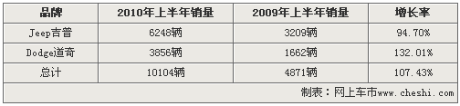 Jeep吉普和Dodge道奇兩大品牌在2010年上半年銷量已經超過2009年全年的總銷量。2010年上半年Jeep吉普品牌車型銷量達6248量,較去年上半年增長了94.7%。