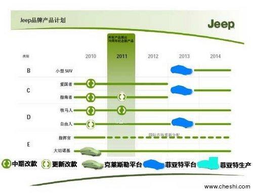 通過Jeep近兩年的產品規(guī)劃圖可以看出,Jeep自由人將于2013年開始使用菲亞特生產平臺前,而且在明年還將推出新款自由人。Jeep牧馬人將于明年推出70周年紀念版車型,并且一直持續(xù)生產。除Jeep指揮官將于2010年末停產外,Jeep大切諾基將繼續(xù)保持克萊斯勒血統(tǒng)一直生產,并且新款大切諾基將于今年年底引入國內。