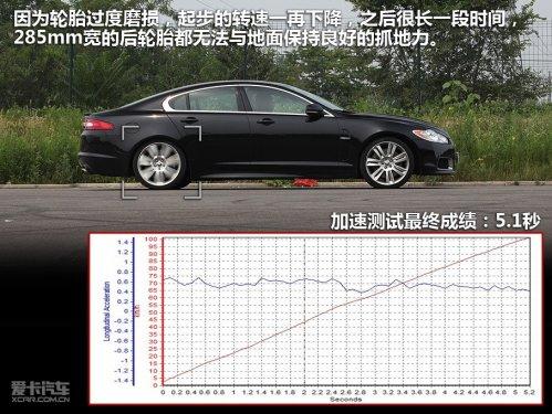 當(dāng)進行加速測試時,按慣例我們會阻止所有電子系統(tǒng)介入,將轉(zhuǎn)速維持在發(fā)動機最佳發(fā)力區(qū),在起步的瞬間使輪胎處于滑與不滑的臨界點,之后全力沖刺。不過很抱歉,經(jīng)過多次嘗試,我們無法令XFR獲得最佳的起跑狀態(tài),原因就是因為輪胎過度磨損,起步的轉(zhuǎn)速一再下降,而順利起步之后很長一段時間,285mm寬的后輪胎都無法與地面保持良好的抓地力。通過加速曲線圖也可以看出,起步后接近1秒的時間,加速度都不高,有時還處于下降狀態(tài),最終5.1秒的加速成績并不是XFR的最強能力。