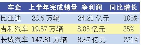 受益于上半年車(chē)市的產(chǎn)銷(xiāo)兩旺,三大車(chē)企的業(yè)績(jī)?nèi)(xiàn)飄紅,其中長(zhǎng)城汽車(chē)取代比亞迪成為業(yè)績(jī)?cè)鲩L(zhǎng)最迅速的民營(yíng)車(chē)企,吉利汽車(chē)忙于整合沃爾沃轎車(chē)業(yè)務(wù),暫時(shí)沒(méi)有突出表現(xiàn)。