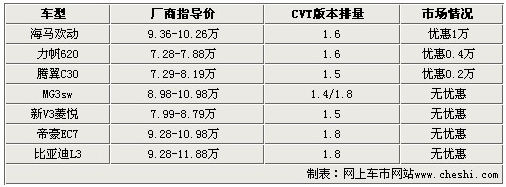 通過以上表格,我們可以清楚的看出,7款車當中,除了上市時間比較久的海馬歡動和力帆620以外,其他幾款車型都僅有小幅度降價或不降價。由于幾款車型剛剛上市不久,所以我們對它們價格優(yōu)惠的期望也并不大。