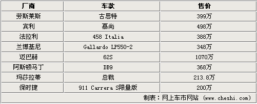 這次成都車展勞斯萊斯、賓利、法拉利、蘭博基尼等高端品牌悉數(shù)參展,為成都的消費(fèi)者帶來了其當(dāng)家車款,比如古思特、慕尚、458 Italia、Gallardo LP550-2都是上市不久的新車,邁巴赫在車展上首發(fā)了其全新一代62S,預(yù)計(jì)售價(jià)1070萬元,而保時(shí)捷也發(fā)布了911 Carrera S Porsche Carrera Cup Asia,限量發(fā)售30臺(tái)預(yù)售200萬。