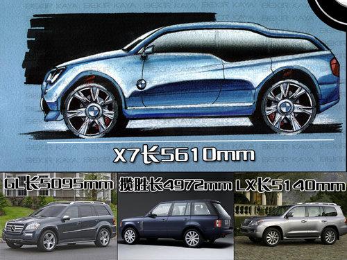 我們目前所獲得的X7的圖片僅僅是寶馬官方草圖和假象圖,不過這對(duì)于車型的未來展望已經(jīng)足夠了。寶馬X7將會(huì)基于成熟的X5平臺(tái)并且做一定修改,車身尺寸方面會(huì)比X5長(zhǎng)760mm左右,那就是達(dá)到了驚人的5610mm。要知道目前最新款的奔馳GL550的車長(zhǎng)不過才5095mm,寶馬X7全面超越奔馳GL級(jí)算得上是真正意義上的全尺寸SUV。