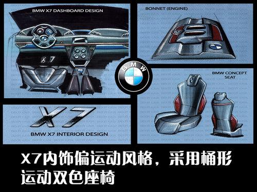 從寶馬X7的內(nèi)飾草圖可以看出偏向運(yùn)動(dòng)風(fēng)格,有棱有角的中控臺(tái)和不規(guī)則的方向盤彰顯其與眾不同。桶形賽車座椅極富現(xiàn)代感,腰部?jī)蓚?cè)支撐與座椅主體采用不同色的搭配。