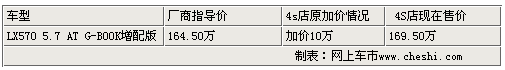 如果提到豪華SUV,大家一定首先想到寶馬X6、奔馳GL、保時捷卡宴以及路虎攬勝等豪華SUV中的“大佬”們,作為國際知名越野極強悍的汽車品牌,雷克薩斯的每一款車型都可謂經(jīng)典,而雷克薩斯LX570又重新詮釋了豪華SUV的新尺度,與上一代的LX470相比,你卻不得不承認雷克薩斯的LX系列正在以跨越的方式完成自己的進化。近日,近日根據(jù)網(wǎng)上車市價格檢測系統(tǒng)顯示,目前雷克薩斯豪華SUV-LX570加價較上段時間的10萬元較少了一半,僅加價5萬進行銷售,而且有現(xiàn)車供應(yīng),具體情況請參照下表: