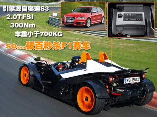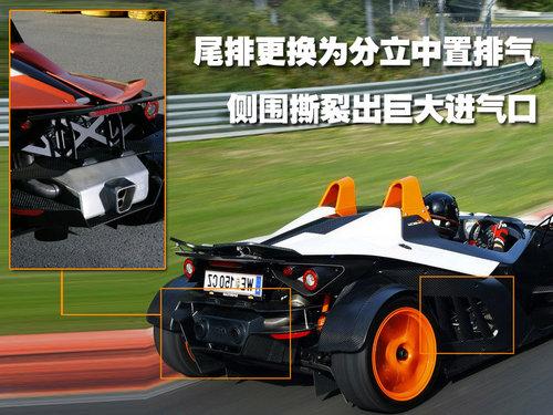 KTM制造了迄今為止最強(qiáng)大的一臺(tái)X-BOW。新款的車型被命名為X-BOW R,引擎源自?shī)W迪的S3車型,這臺(tái)S3引擎原先調(diào)校輸出已有265匹,移植到R身上,輸出功率已經(jīng)被調(diào)至300匹。經(jīng)過簡(jiǎn)單計(jì)算,它的性能幾乎已經(jīng)超越了F1賽車。